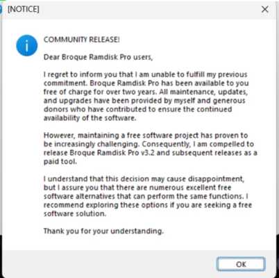 Broque Ramdisk Pro was originally available for free, especially the Windows version, which could be downloaded and used without charge. However, since the software was maintained solely by the developer, declining donations made it difficult to continue free support. After about two years, the tool shifted to a paid model. The Mac version requires a one time payment of around 2 dollars.